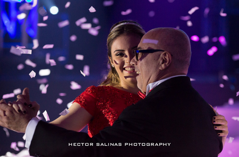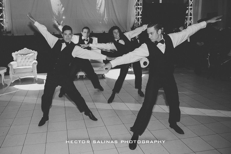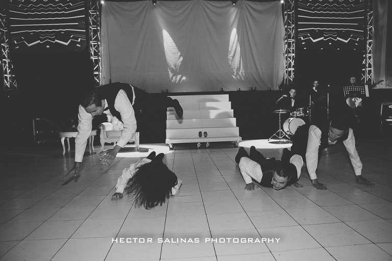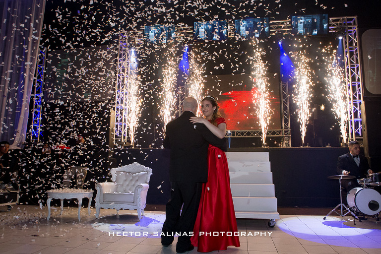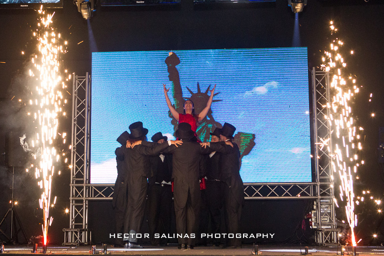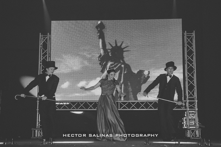 Mientras comenzaba la celebración, un grupo de Jazz amenizó el momento, luego, cerca de las 10 de la noche se vivió una llamativa presentación de la mano de un cuerpo de baile compuesto por bailarines, acróbatas y ejecutor de estilo break dance, que realizaron una pieza musical compuesta por tres estilos del tema “New York New York” de Frank Sinatra que antecedió la presentación a la linda cumpleañera, consolidando así el final de su niñez y el florecimiento de su vida adulta.